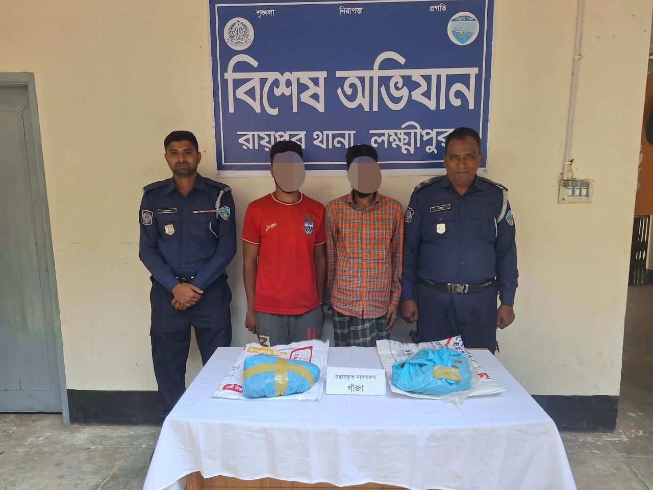 লক্ষ্মীপুরের রায়পুরে পুলিশের বিশেষ অভিযানে এক কেজি গাঁজাসহ দুই মাদক কারবারিকে গ্রেফতার করা হয়েছে। বৃহস্পতিবার রাতে উপজেলার পাটনিগো পোল এলাকায় অভিযান চালিয়ে তাদের আটক করা হয়। আজ শুক্রবার অভিযুক্তদের আদালতে সোপর্দ করা হয়েছে। গ্রেফতারকৃতরা হলেন পৌরসভার ২ নম্বর ওয়ার্ডের বাসিন্দা মো. দেলোয়ার হোসেন (৩৫) ও উদমারা গ্রামের বাসিন্দা। মোহাম্মদ রিয়ান হোসেন (২২)।